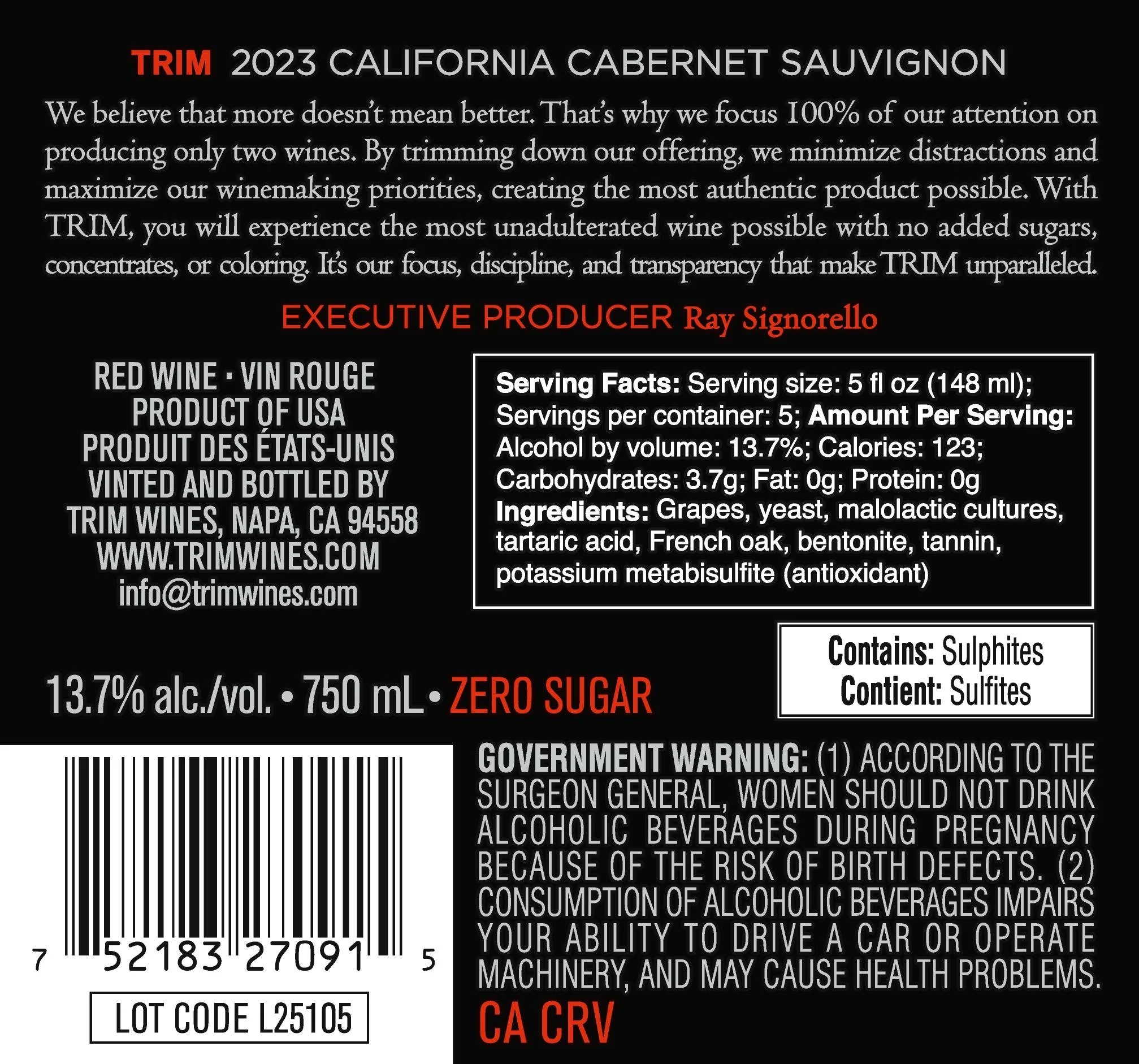 The 2023 TRIM Cabernet Sauvignon hits right on the spot! Stuffed with cherry and bright red fruit, baking spices, perfumed wood nuances, the wine invites you right in. Soft, supple tannins make this immediately approachable with versatility playing into its every sip.